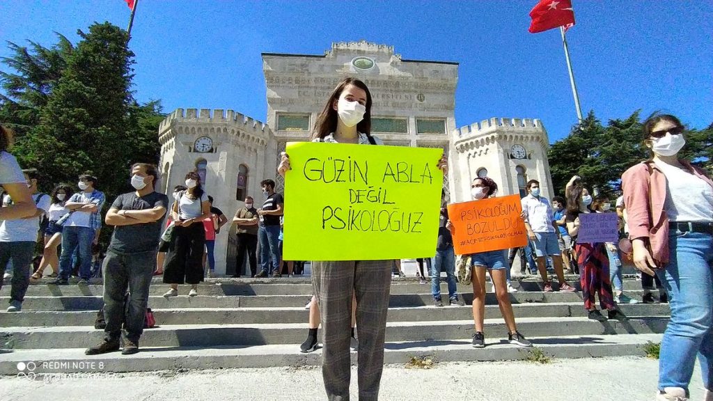 Sosyal medyada tepkiler her gün bir hashtag eylemiyle sürdürülürken, 16 Temmuz 2020’de İstanbul Üniversitesi önünde de sosyal mesafeyi koruyarak mesleki dayanışmayla eylemler ve basın açıklamaları yapıldı. Öğrenciler “Güzin abla değil; psikoloğuz” ve “Psikolojide Açık Öğretime Hayır” gibi dövizler açarak şunları söyledi: “Bizlerin ter dökerek ürettiği bilim ayaklar altına alınıyor. Bizim üzerimizden para kazanan rektörlerle geçinemiyoruz! Psikoloji eğitimi örgün öğretim dışına alınamaz. Bilgisayar başında test çözülerek toplum için bilim üretilemez”