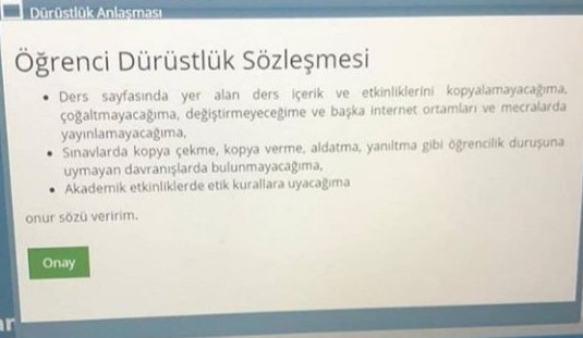 Ayrıca öğrenciler, açtıkları hashtagler üzerinden canlı derse katılım aşamasında kendilerine üniversite yönetiminin zorunlu kıldığı “Öğrenci Dürüstlük Sözleşmesi” onaylatıldığı paylaşımında bulunuyor. Bu anlaşma öğrencilere, derslerin çoğaltılmayacağı, kopyalanmayacağı ve akademik etik kurallara uyulacağı gibi kuralların onur sözüyle onaylanmasını öngörüyor.