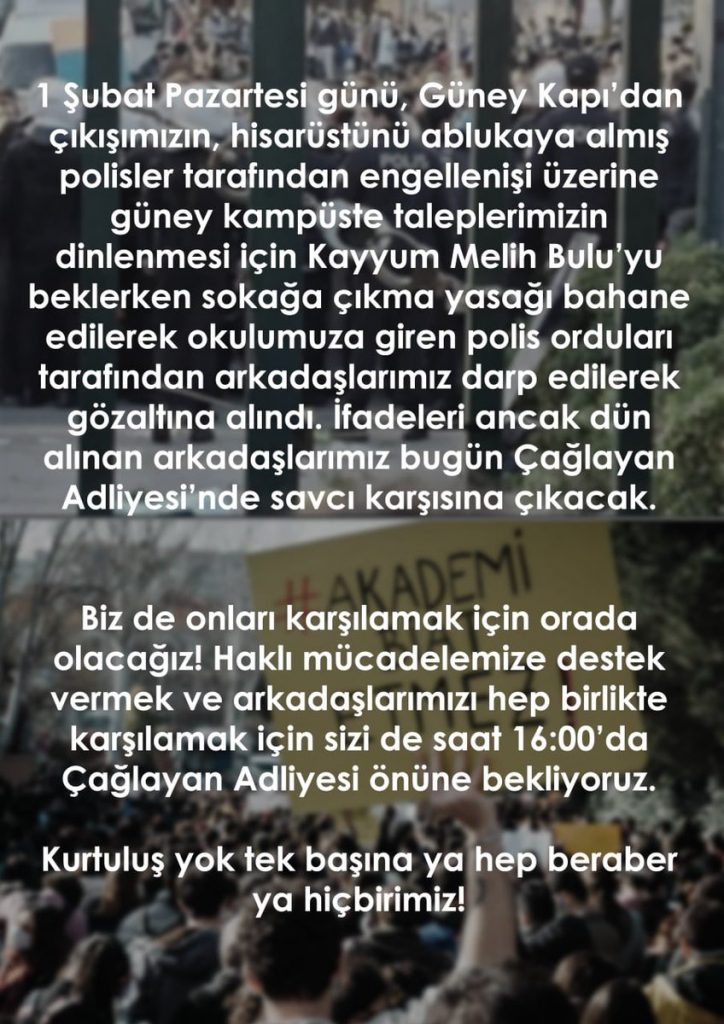 Boğaziçi Dayanışması, 1 Şubat Pazartesi günü gerçekleşen eylemde gözaltına alınan öğrencilerle dayanışmak için çağrıda bulundu. Saat 16:00’da savcı karşısına çıkmak için adliyeye sevk edilen arkadaşlarına destek vermek herkesi Çağlayan Adliyesine çağırdı.